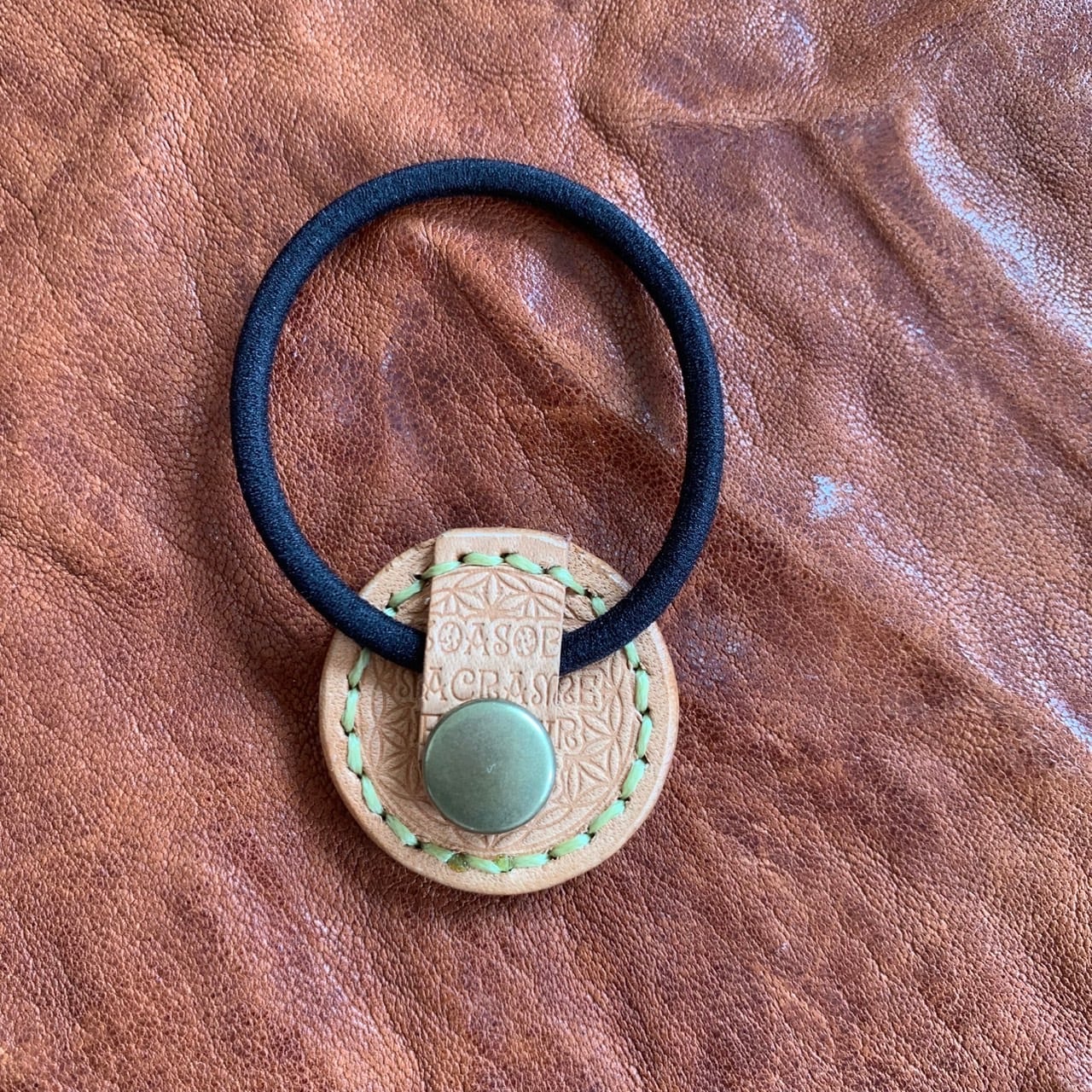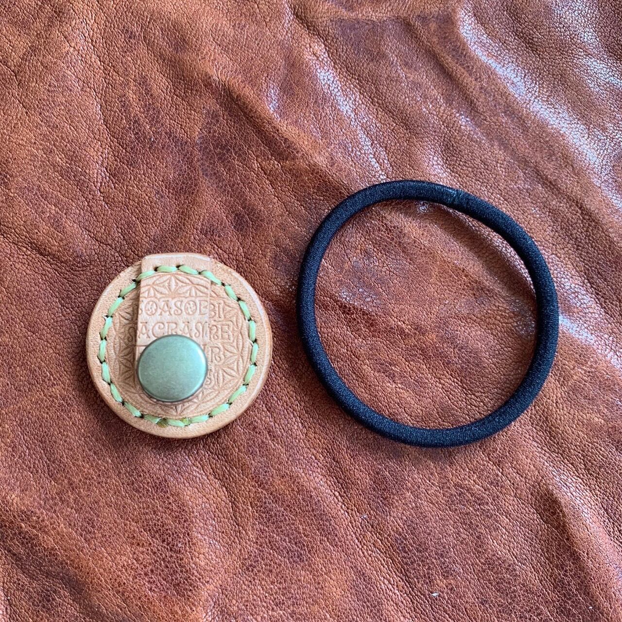 前回制作したヘアゴムよりも、やや厚手のヌメ革を使用する事で丈夫さがよりアップしました。