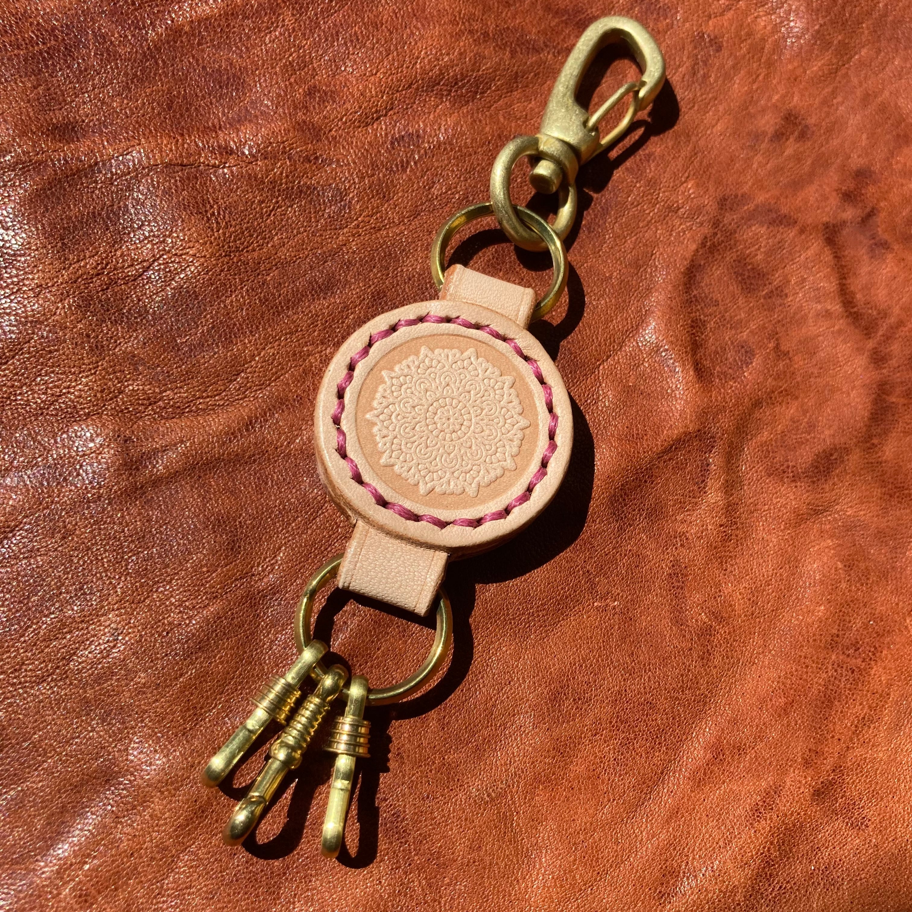 ヌメ革に曼荼羅と糸遊美の刻印を施しています。