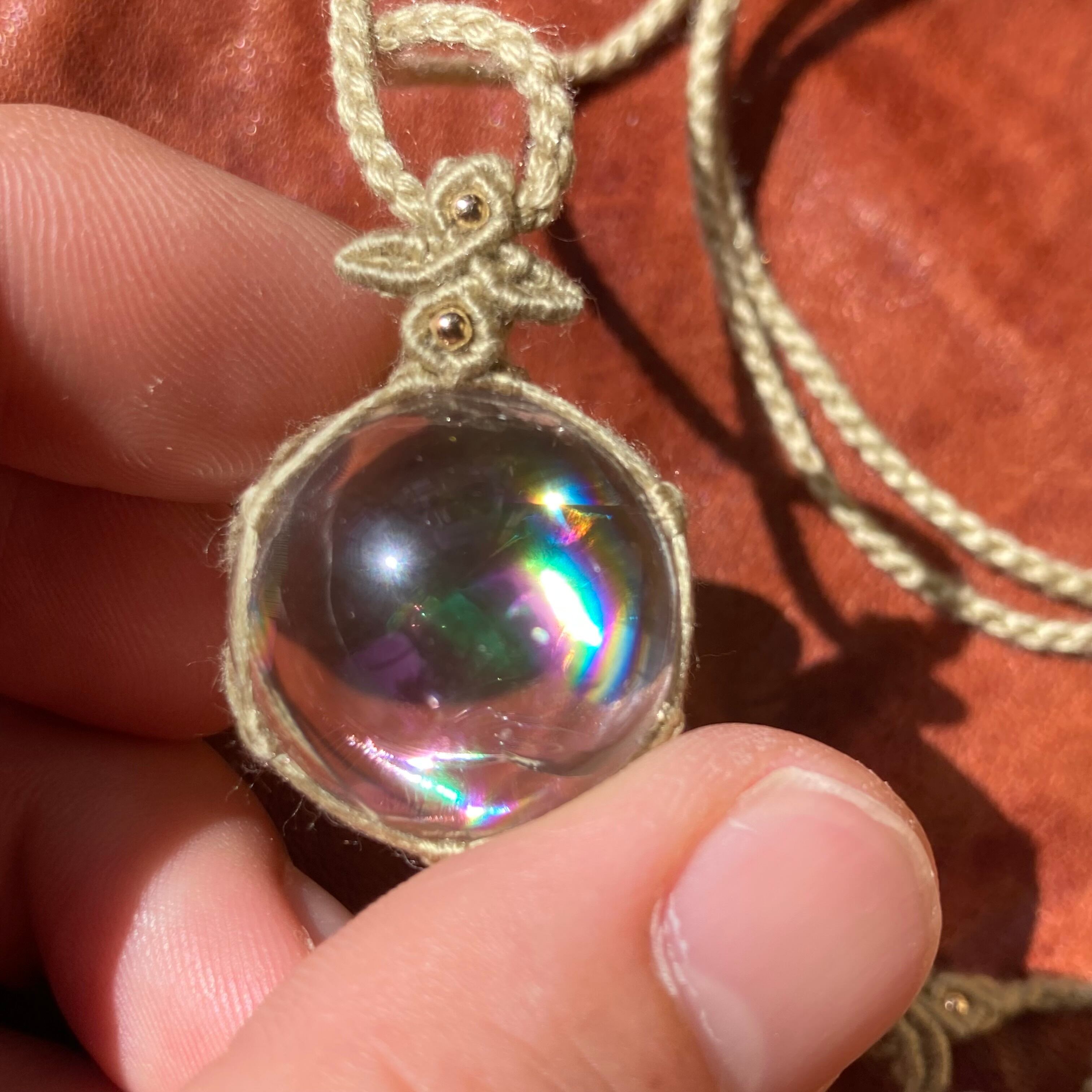 アイリスクォーツを透かし編みする事で虹を最大限に引き出しています。