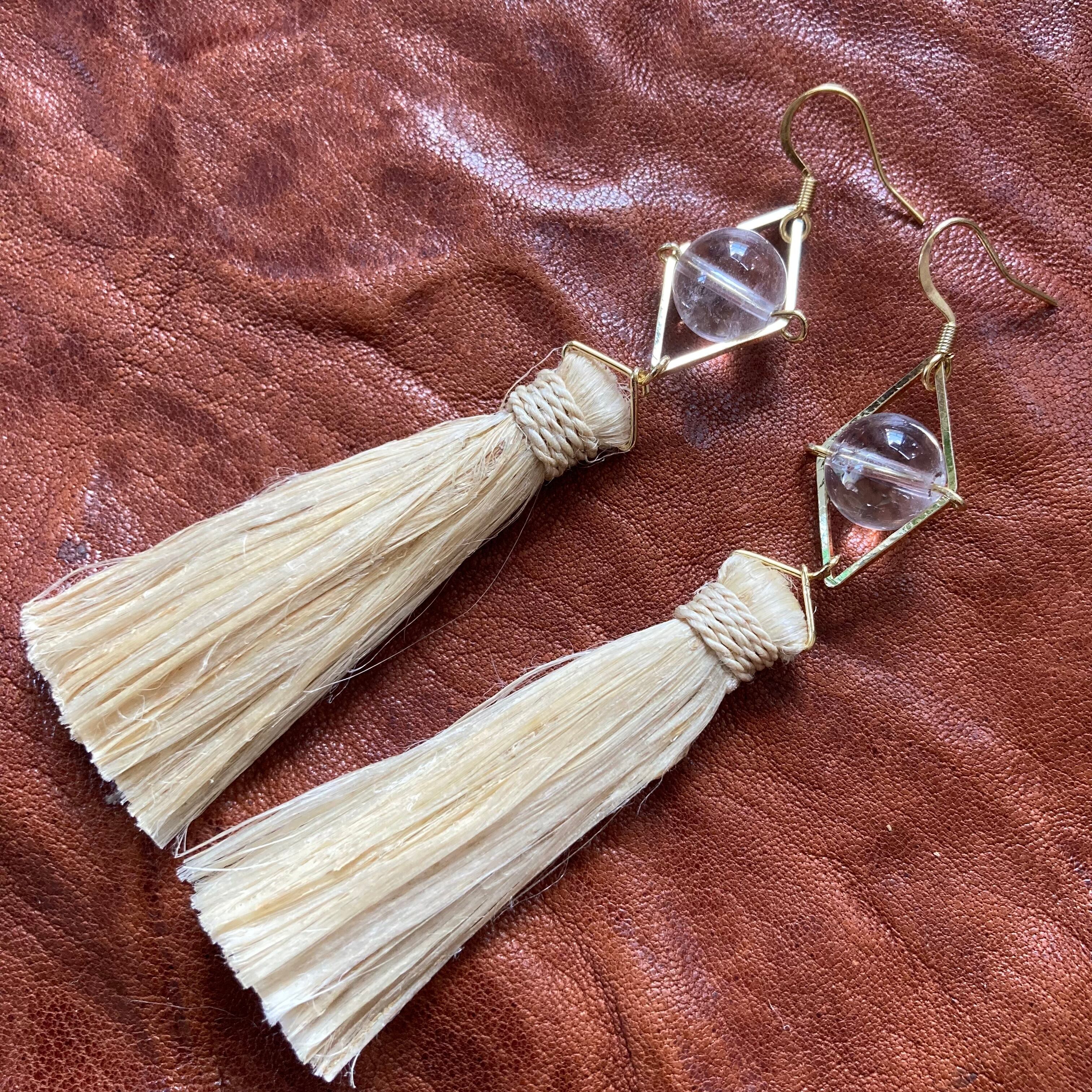 その神聖なる精麻を美しく身に纏えるよう、パーツには14kgfを使用しておりヒマラヤ水晶も入れることによって、より豪華なピアスに仕上がっています。