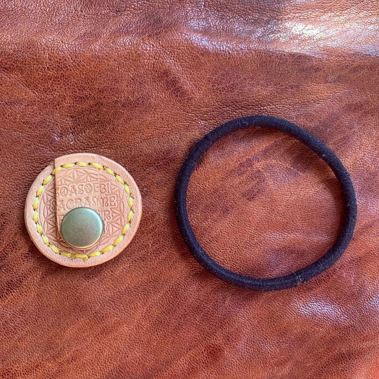 前回制作したヘアゴムよりも、やや厚手のヌメ革を使用する事で丈夫さがよりアップしました。