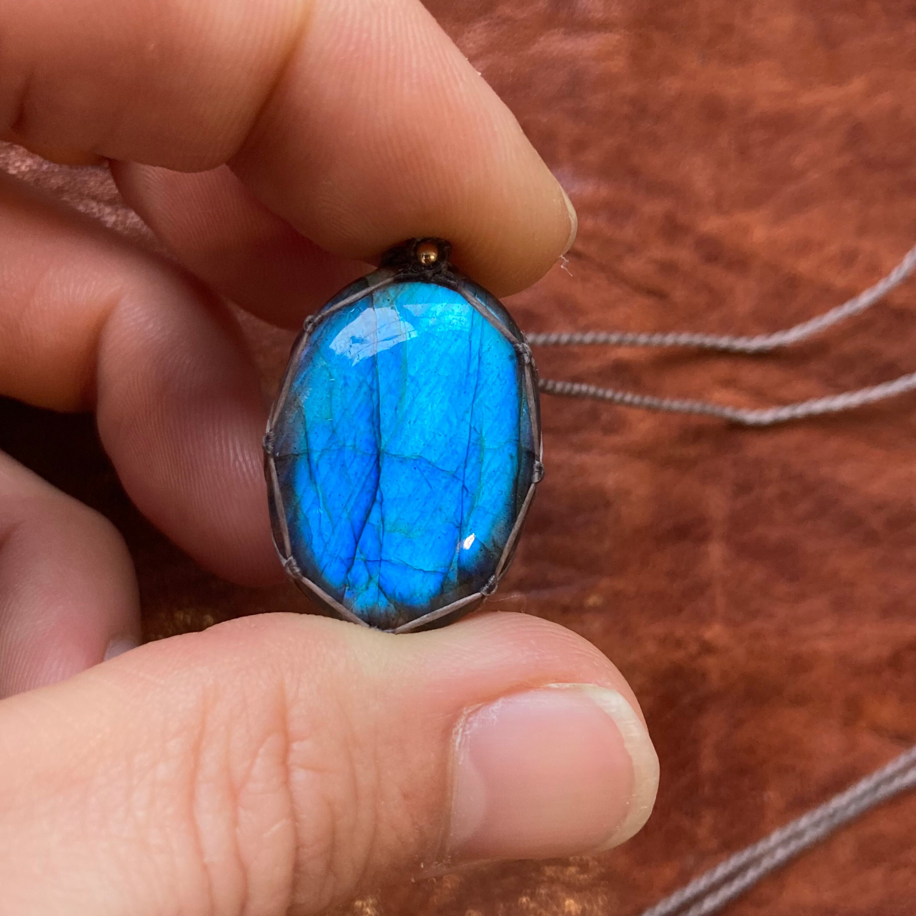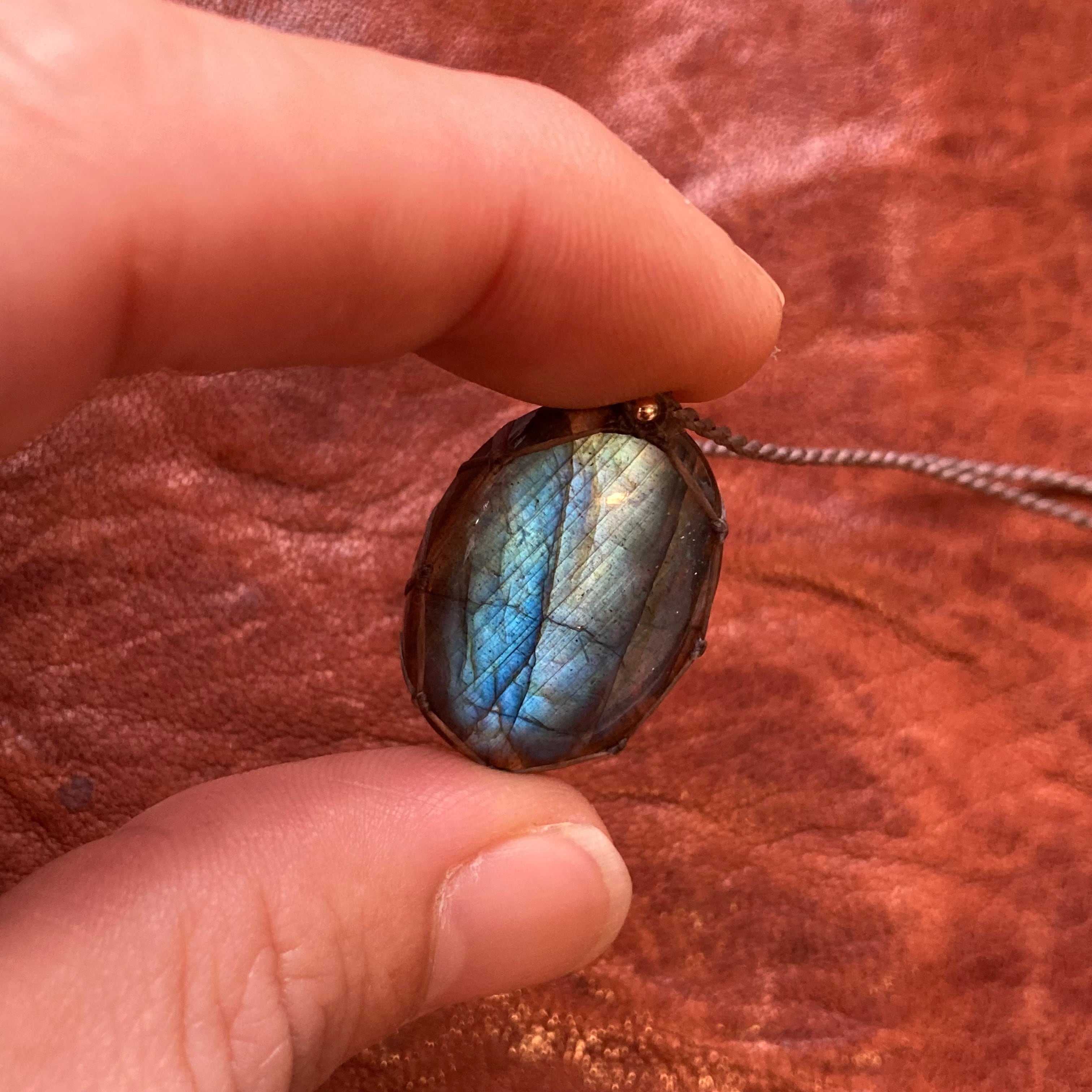 天然石の魅力を最大限に引き立てる様に素肌のままの天然石を、極細のワックスコードで透かしフレーム編みを緩みなくしっかりと編みました。