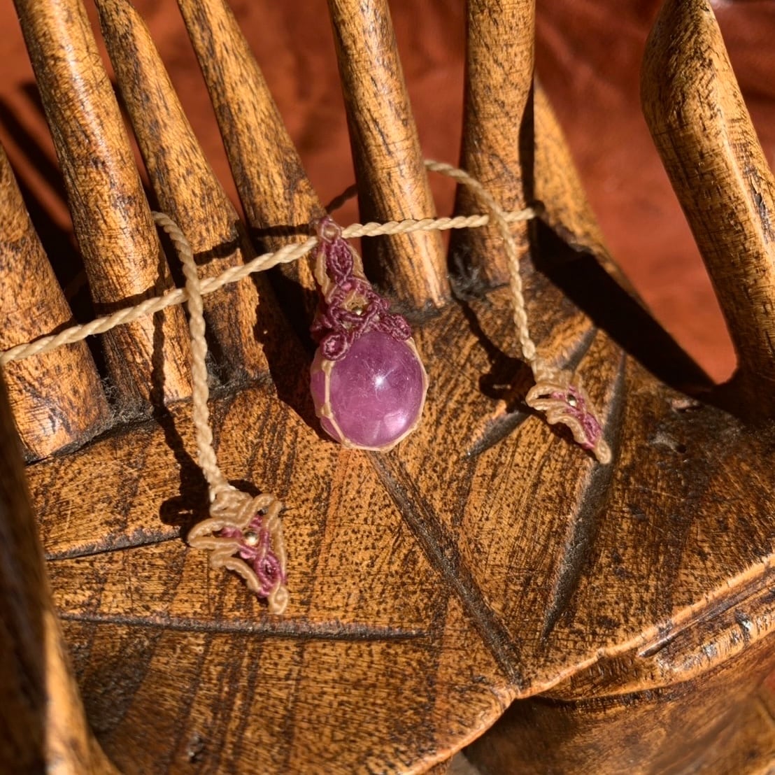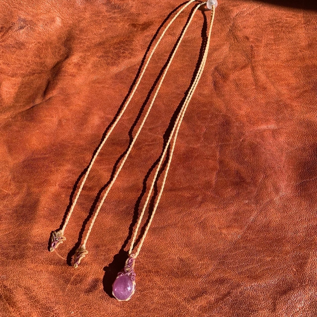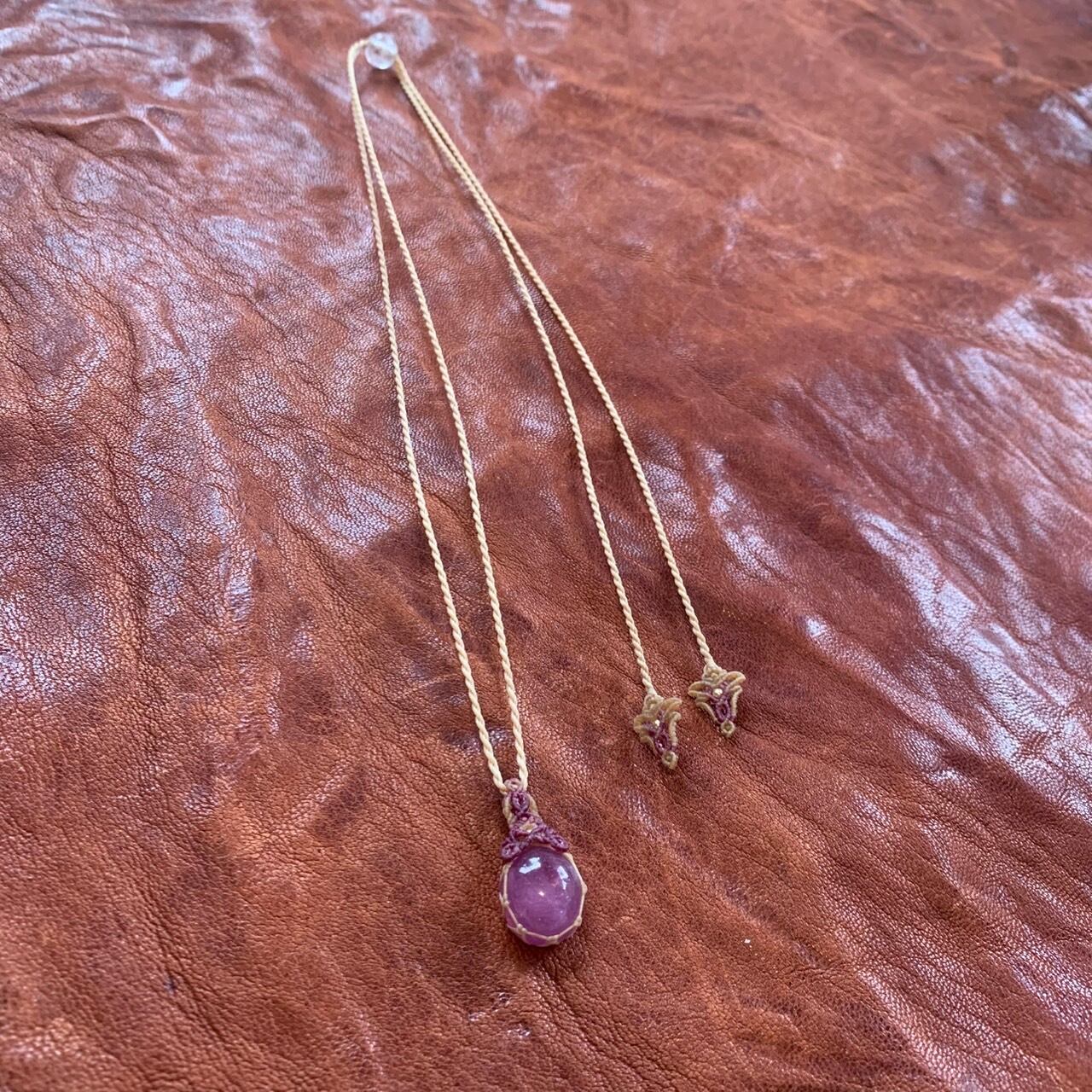 天然石の魅力を最大限に引き立てる様に素肌のままの天然石を、極細のワックスコードで透かしフレーム編みを緩みなくしっかりと編み、バチカンと首紐のエンド部分には細かなマクラメ装飾を施しました。