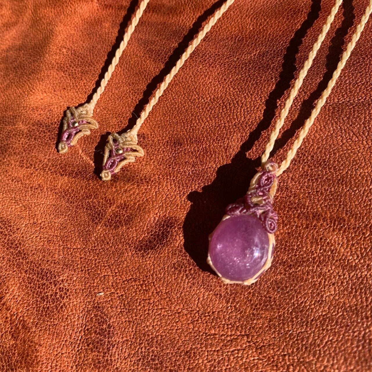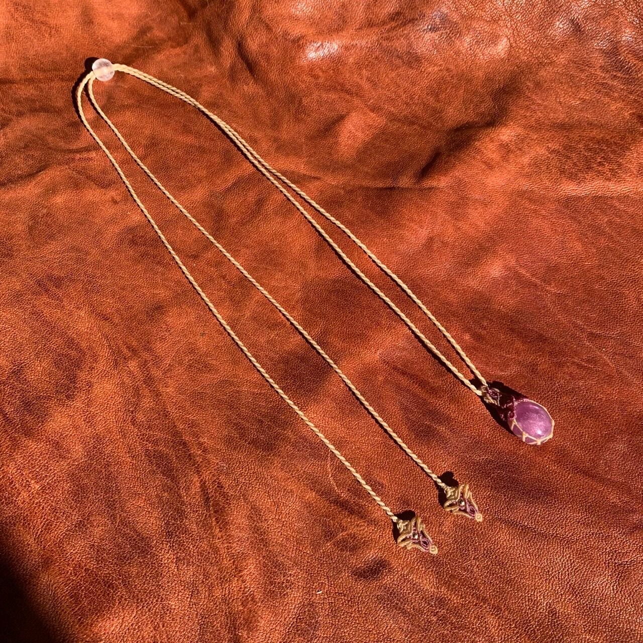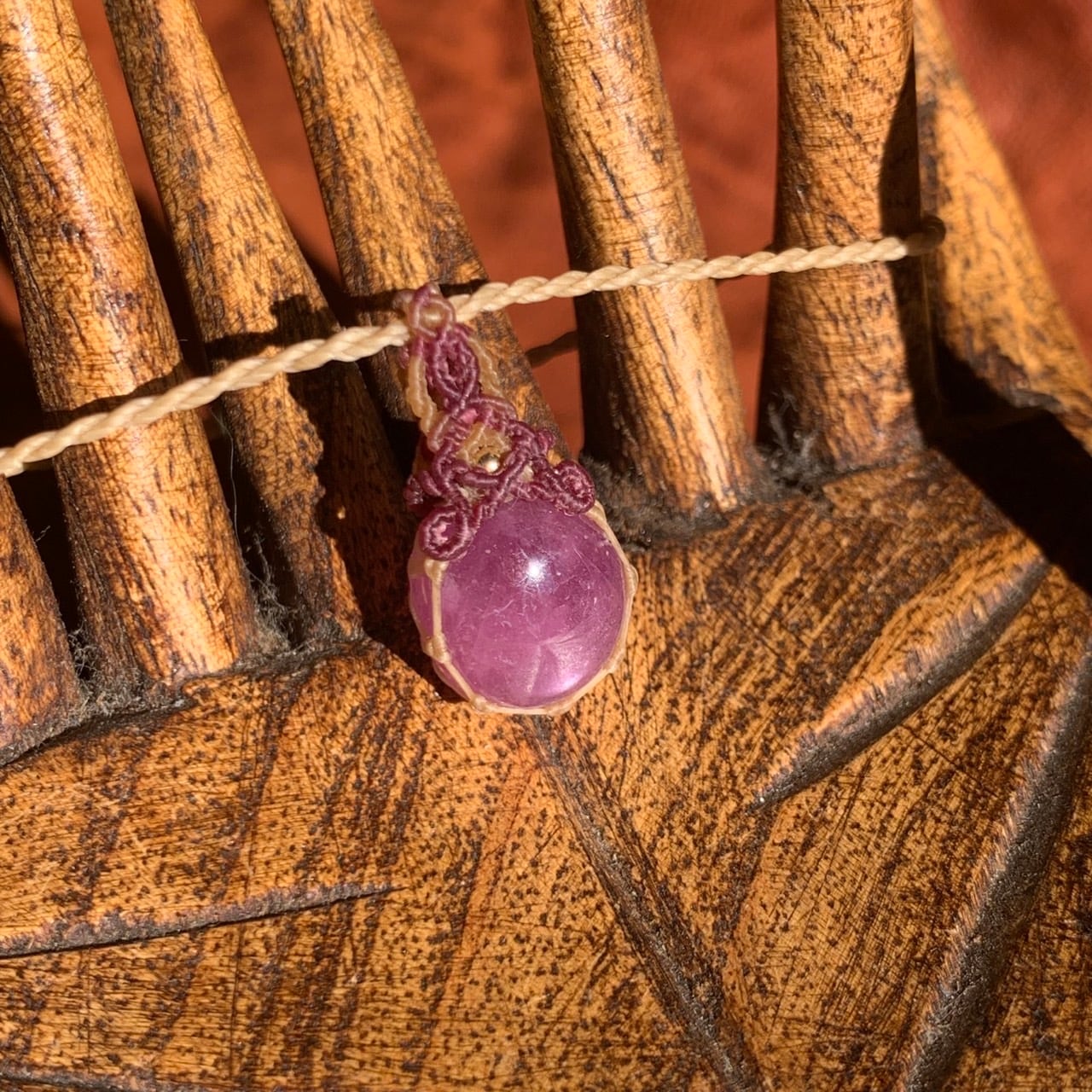 天然石の魅力を最大限に引き立てる様に素肌のままの天然石を、極細のワックスコードで透かしフレーム編みを緩みなくしっかりと編み、バチカンと首紐のエンド部分には細かなマクラメ装飾を施しました。
