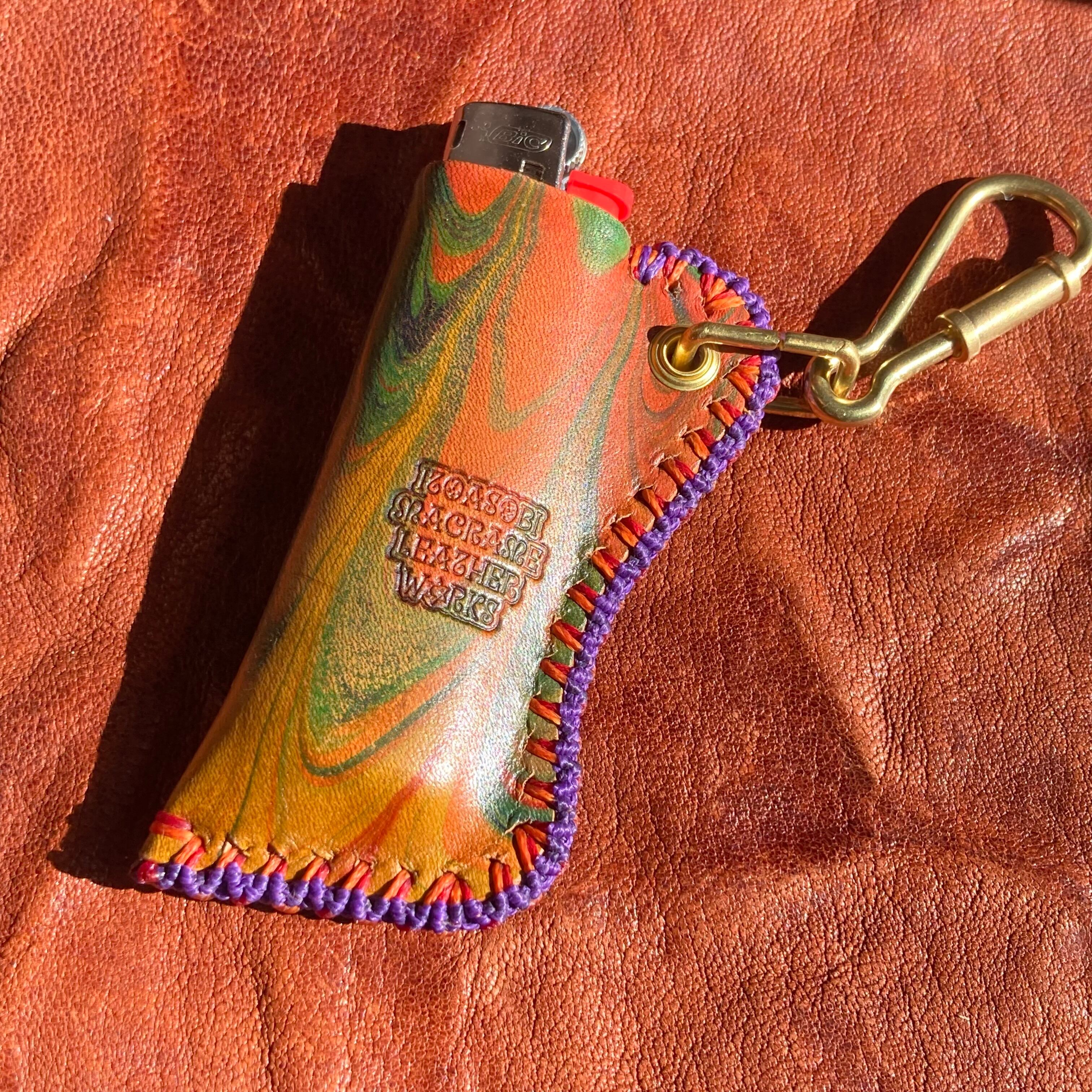 木目調のサイケなマーブリング染めにアンティックダイを施したレザーを使ったオリジナルのBicライターカバーです。
