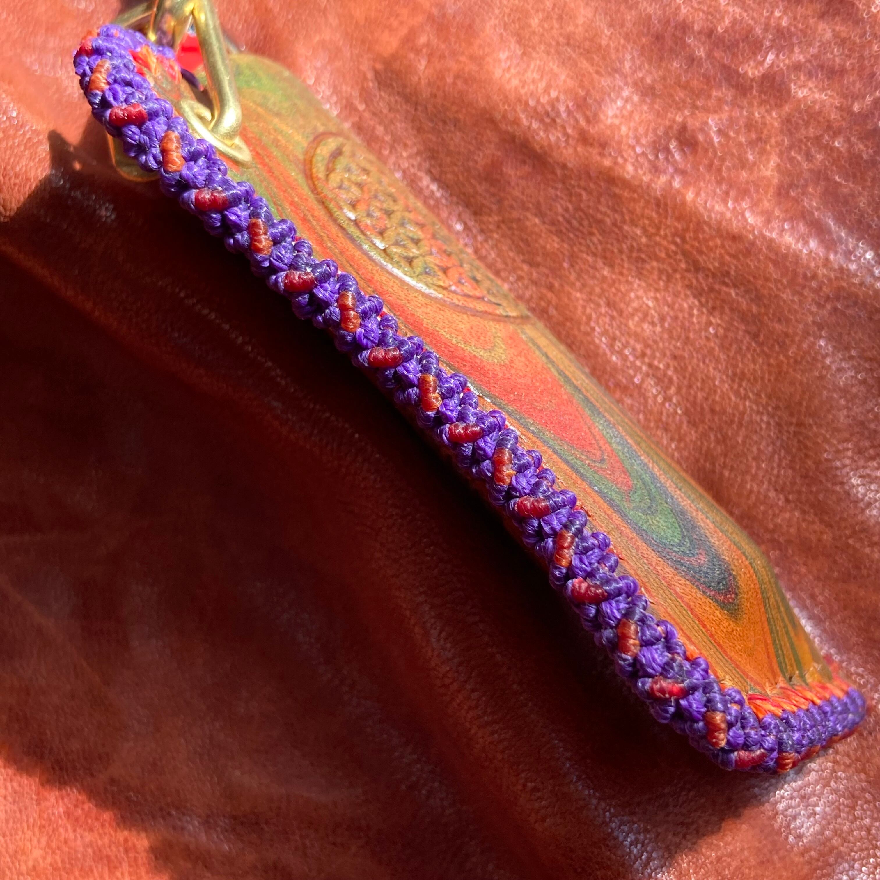 コバ(革の縫い合わせ面)には縫って編む動作を繰り返し手間をかけたマクラメ装飾のステッチを施しています。