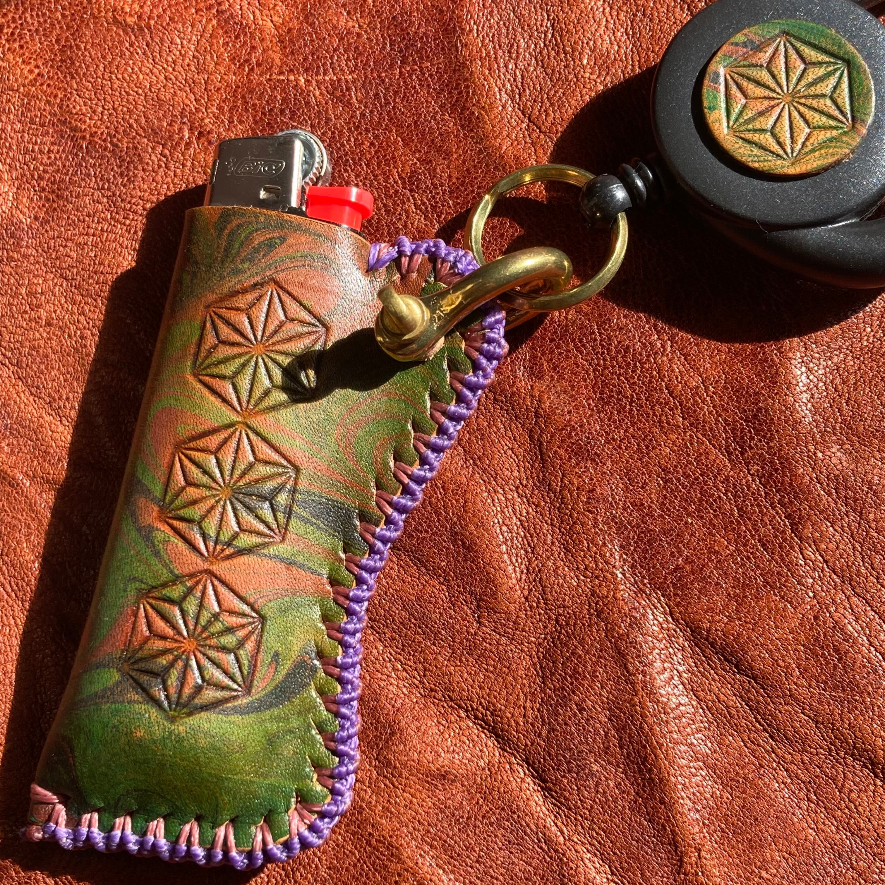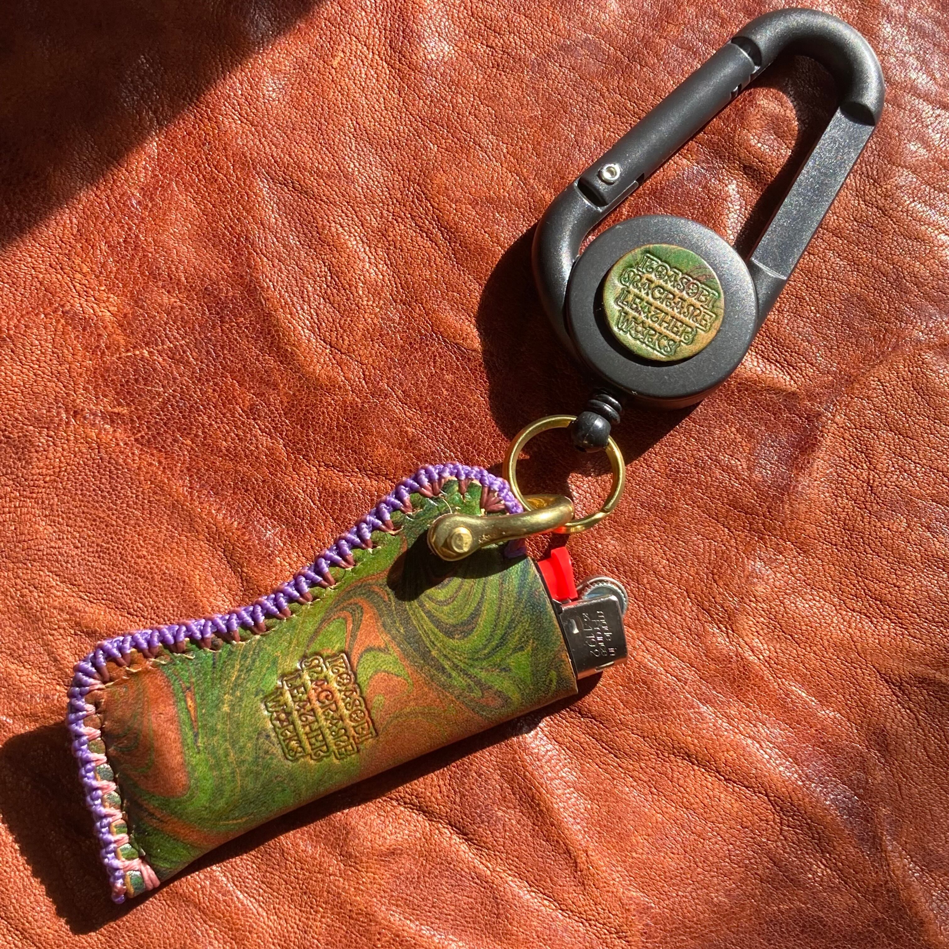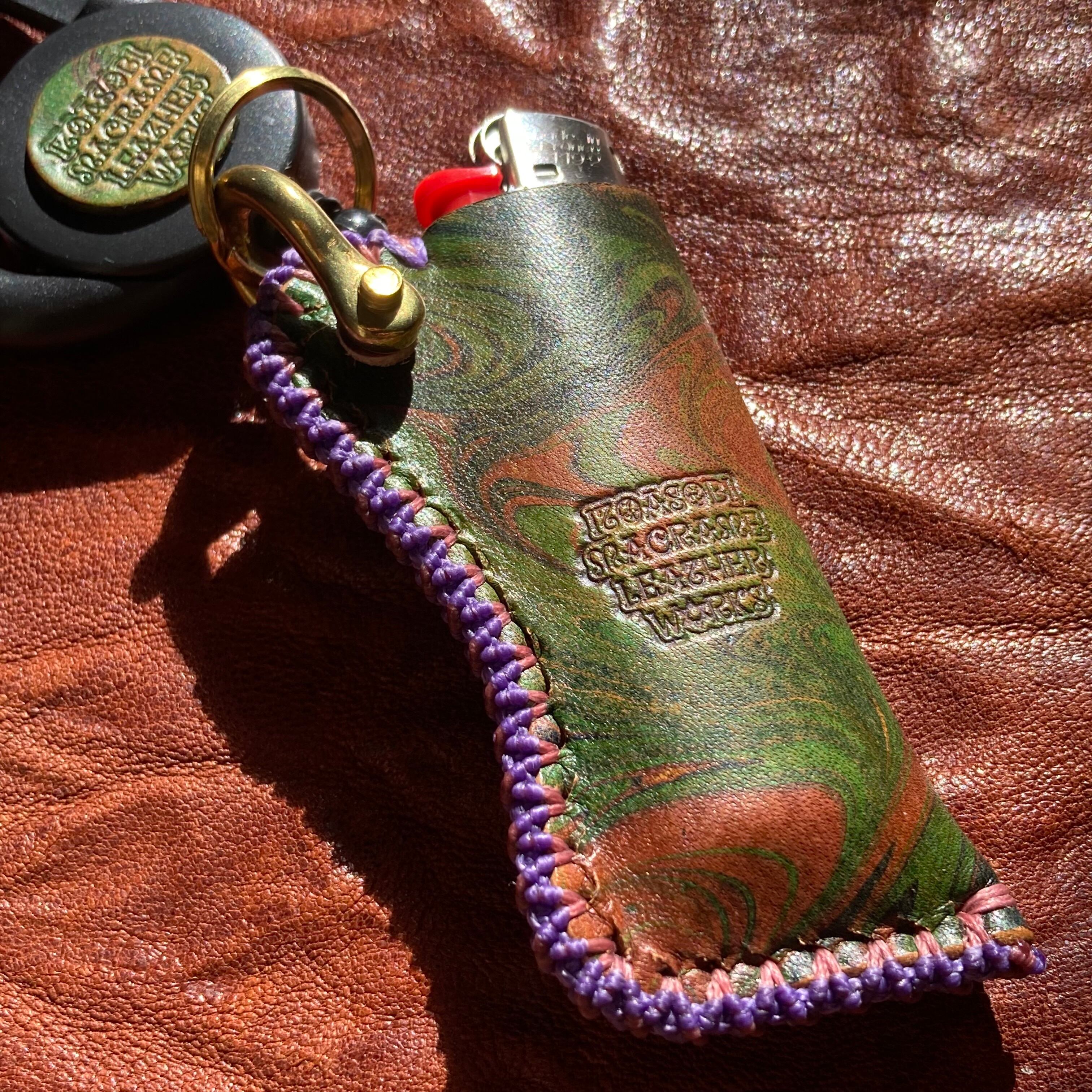 渋みのあるカラーのサイケなマーブリング染めのレザーにアンティックダイを施したオリジナルのBicライターカバーです。