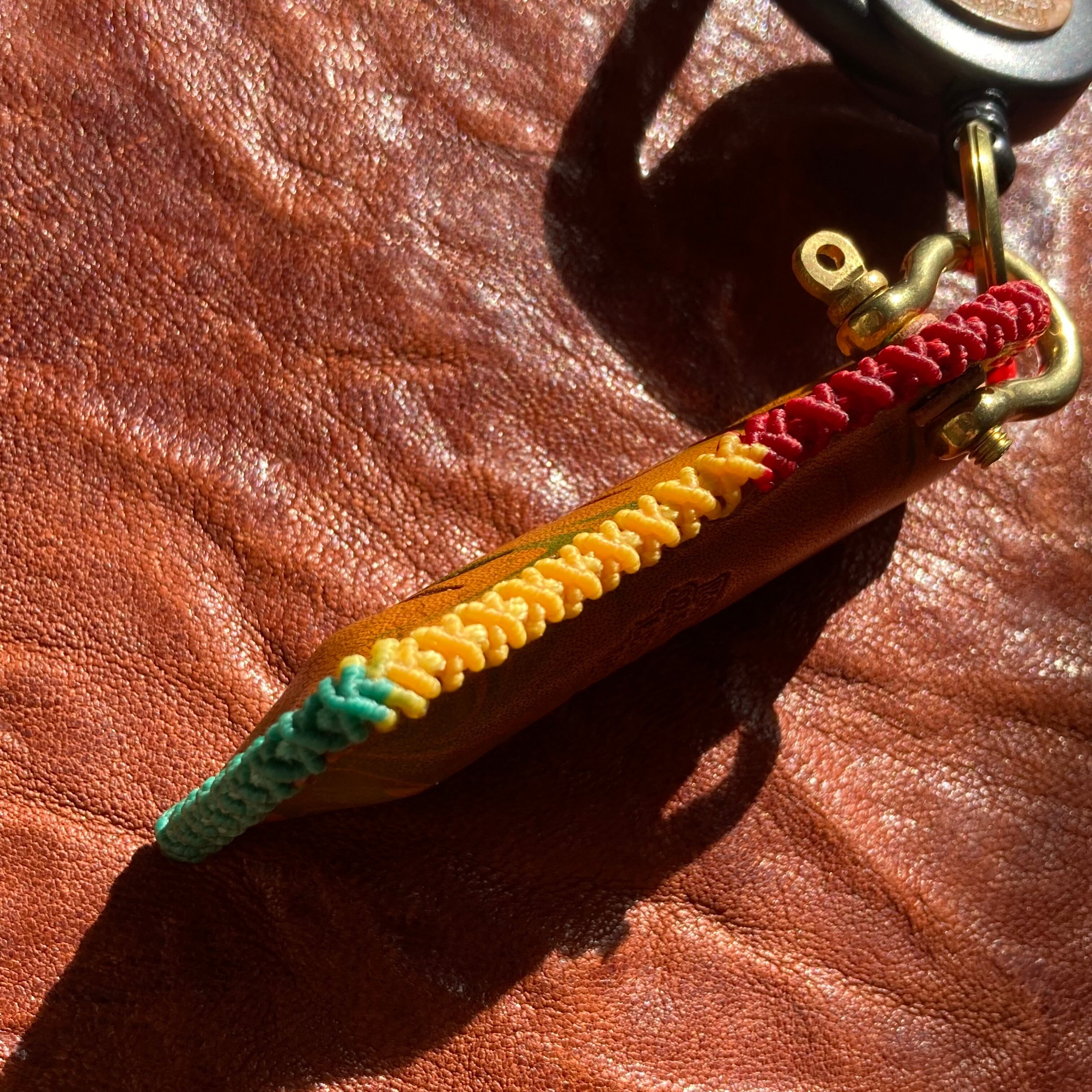 コバ(革の縫い合わせ面)には縫って編む動作を繰り返し手間をかけたラスタカラーのマクラメ装飾のステッチを施しています。