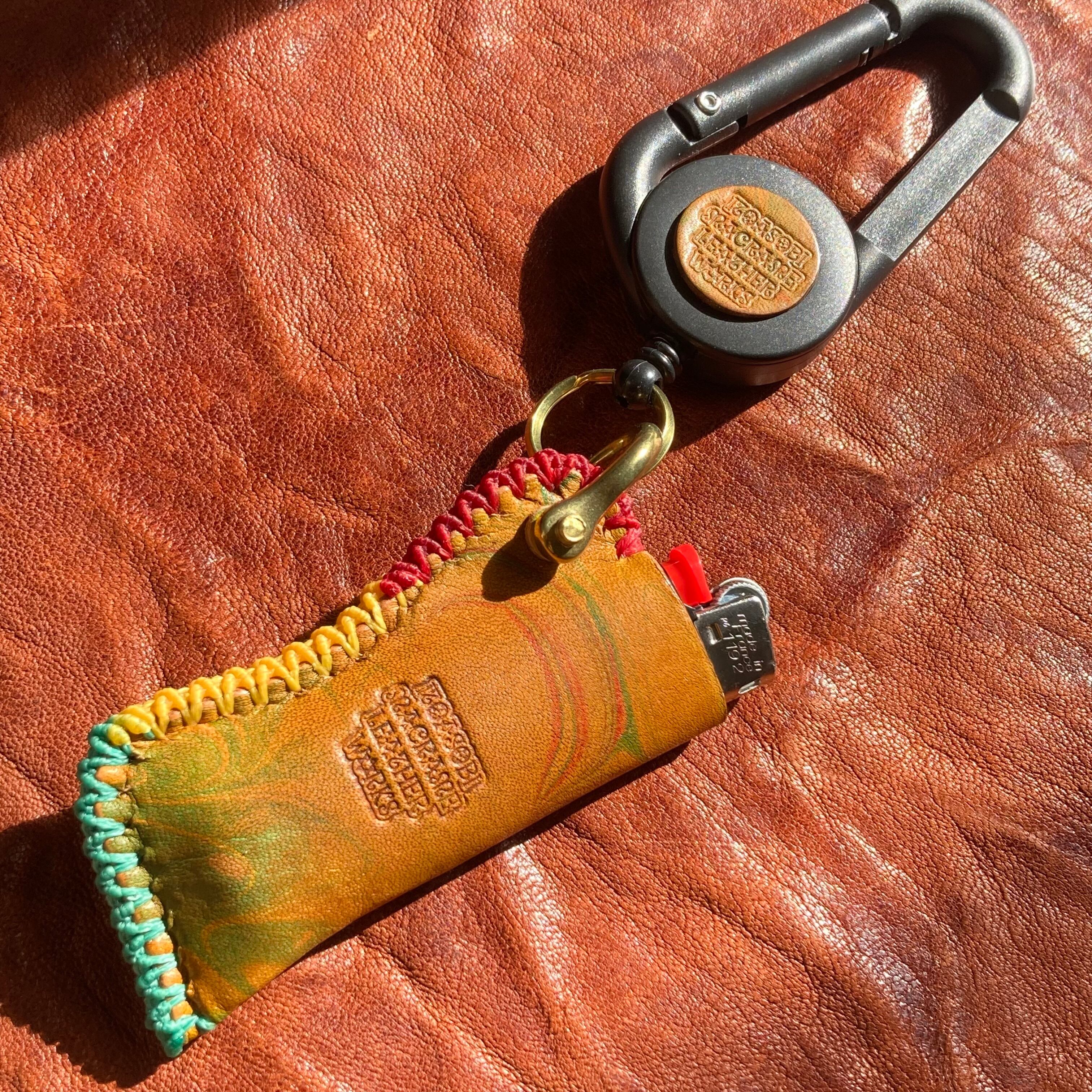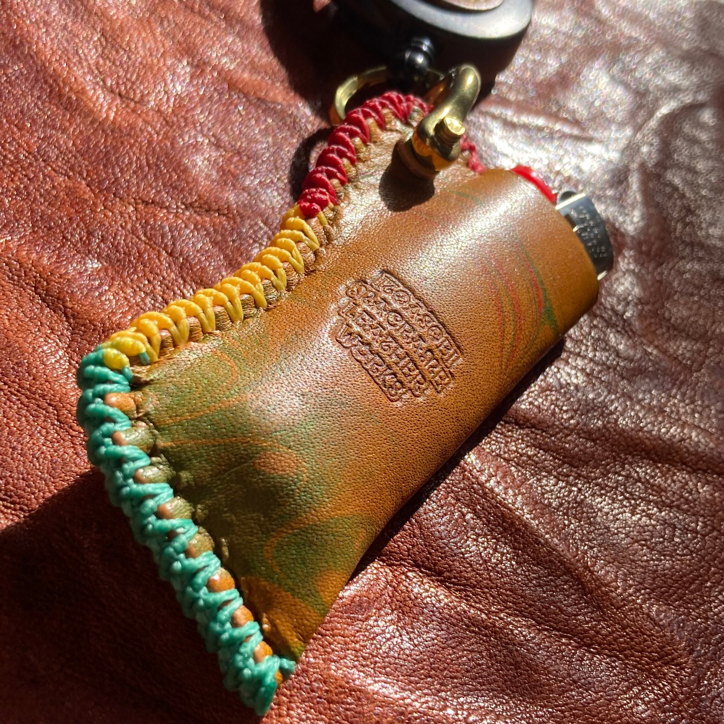 ラスタカラーのマーブリング染めにアンテックダイを施したレザーを使ったオリジナルのBicライターカバーです。