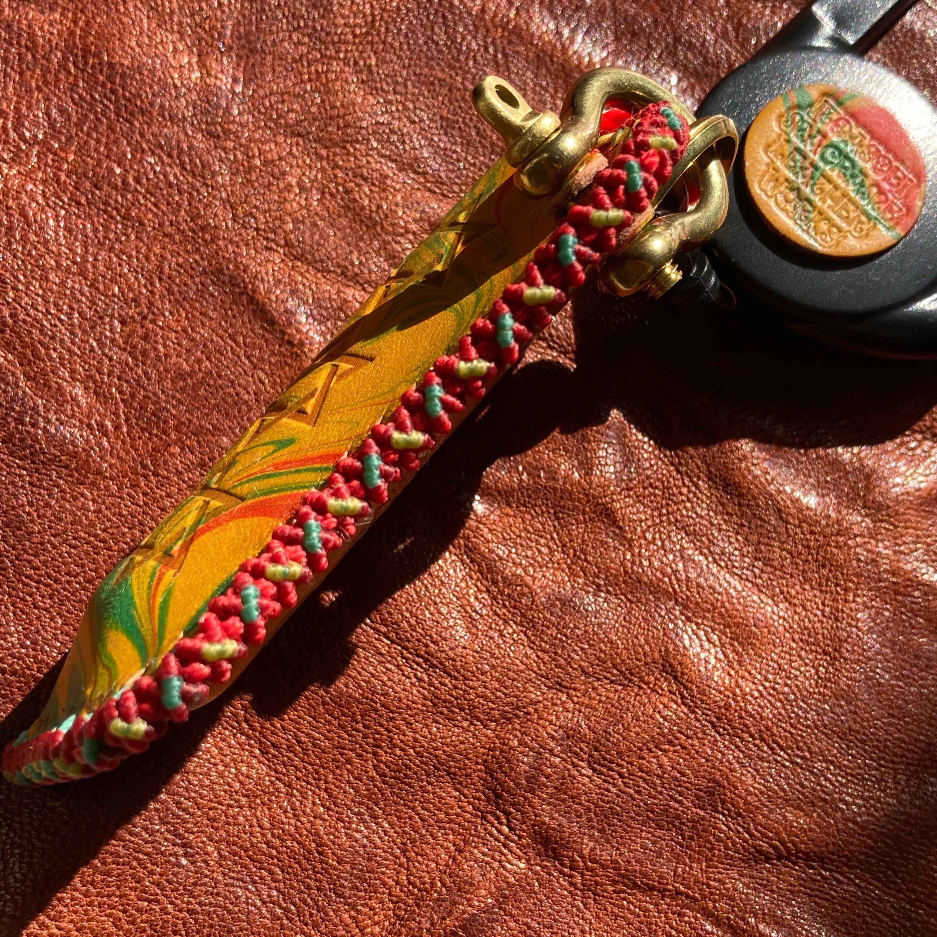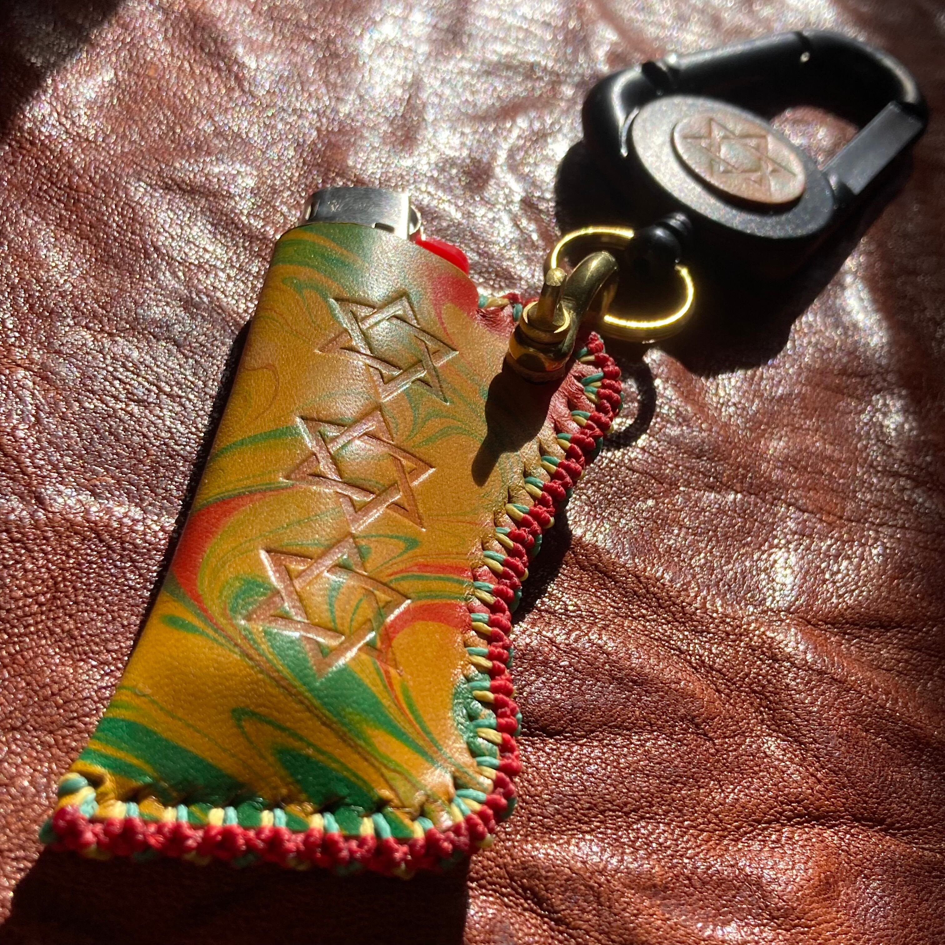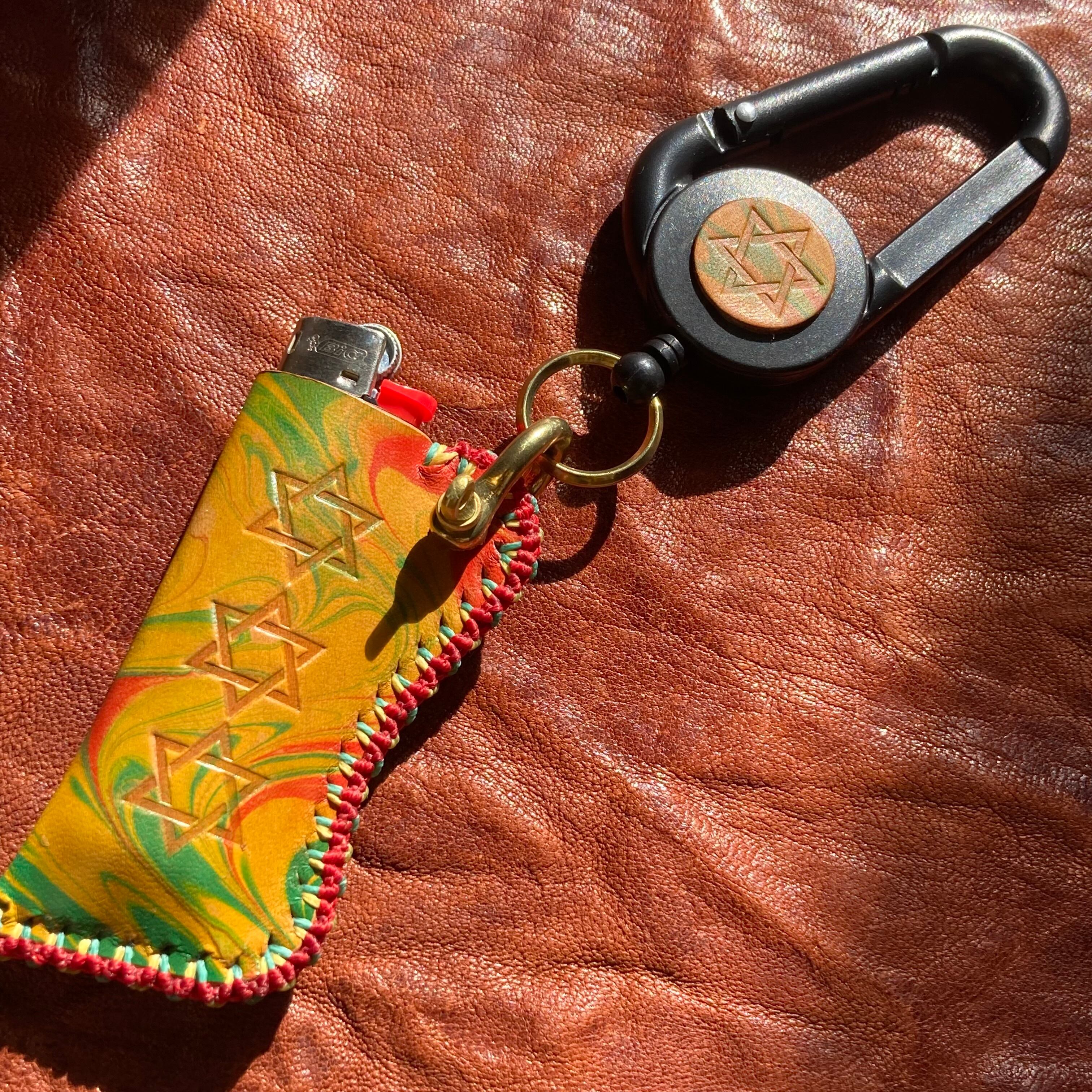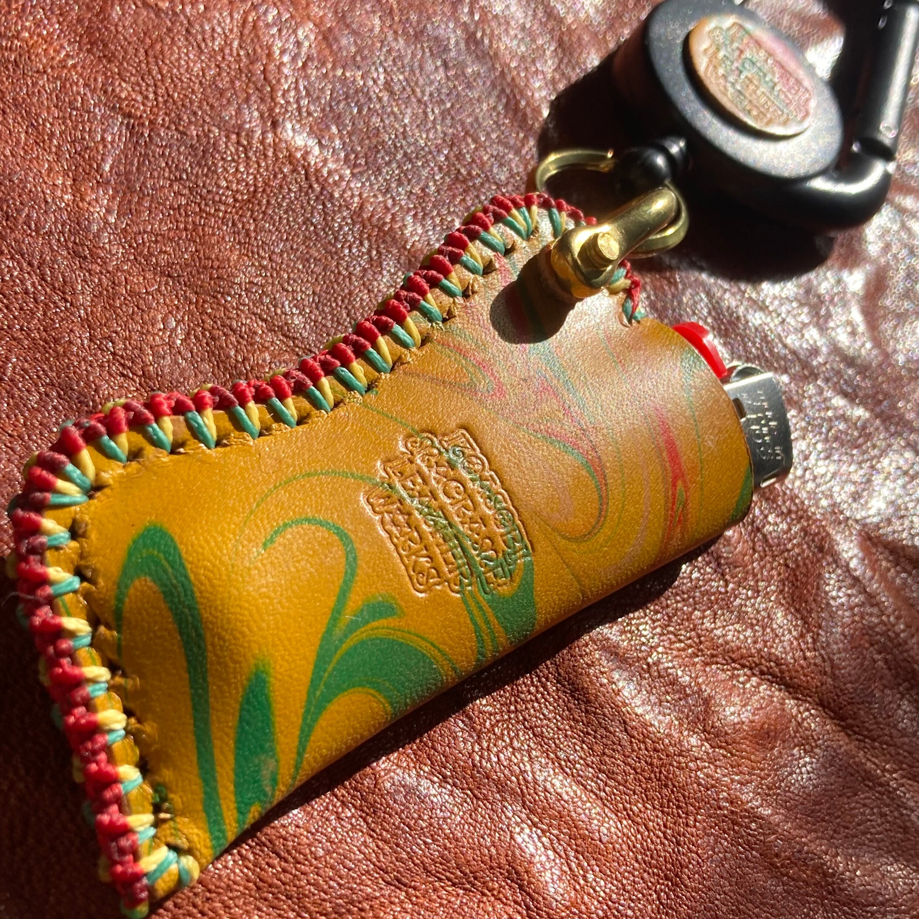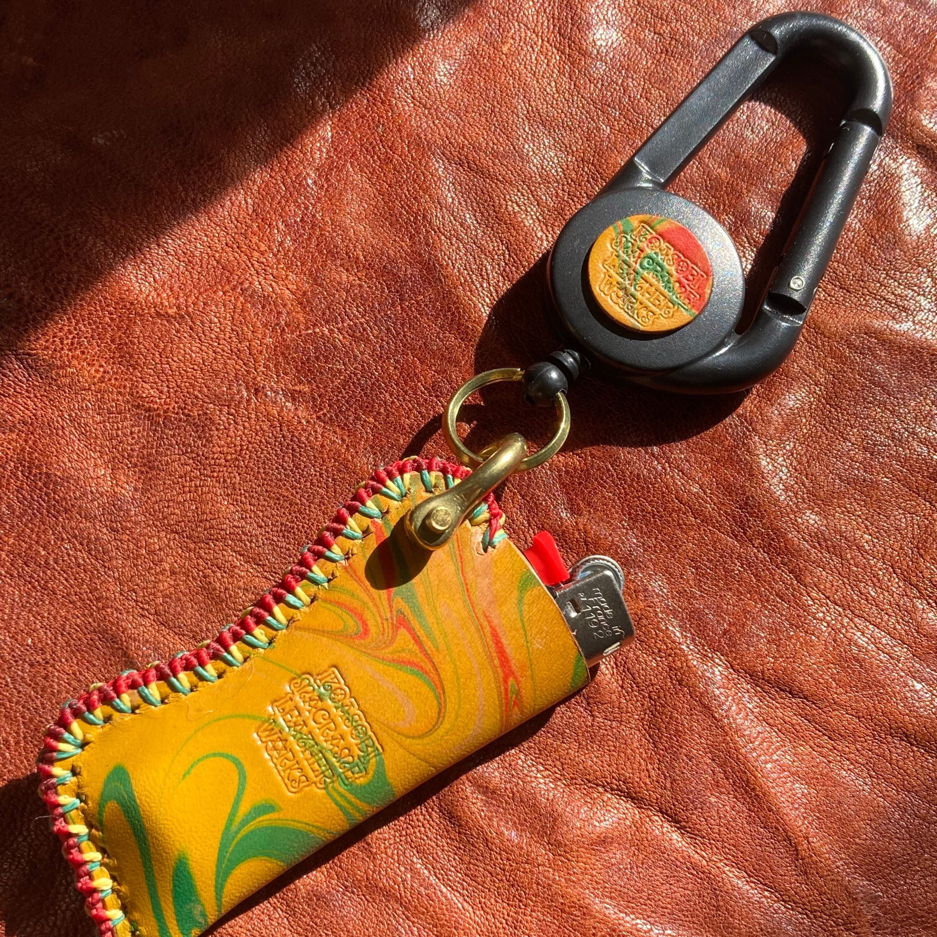 ラスタカラーのマーブリング染めのレザーを使ったオリジナルのBicライターカバーです。