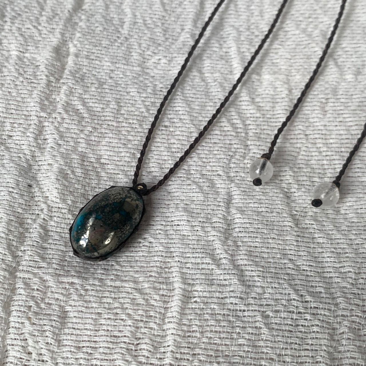 天然石の魅力を最大限に引き立てる様に素肌のままの天然石を、極細のワックスコードで透かしフレーム編みを緩みなくしっかりと編みました。