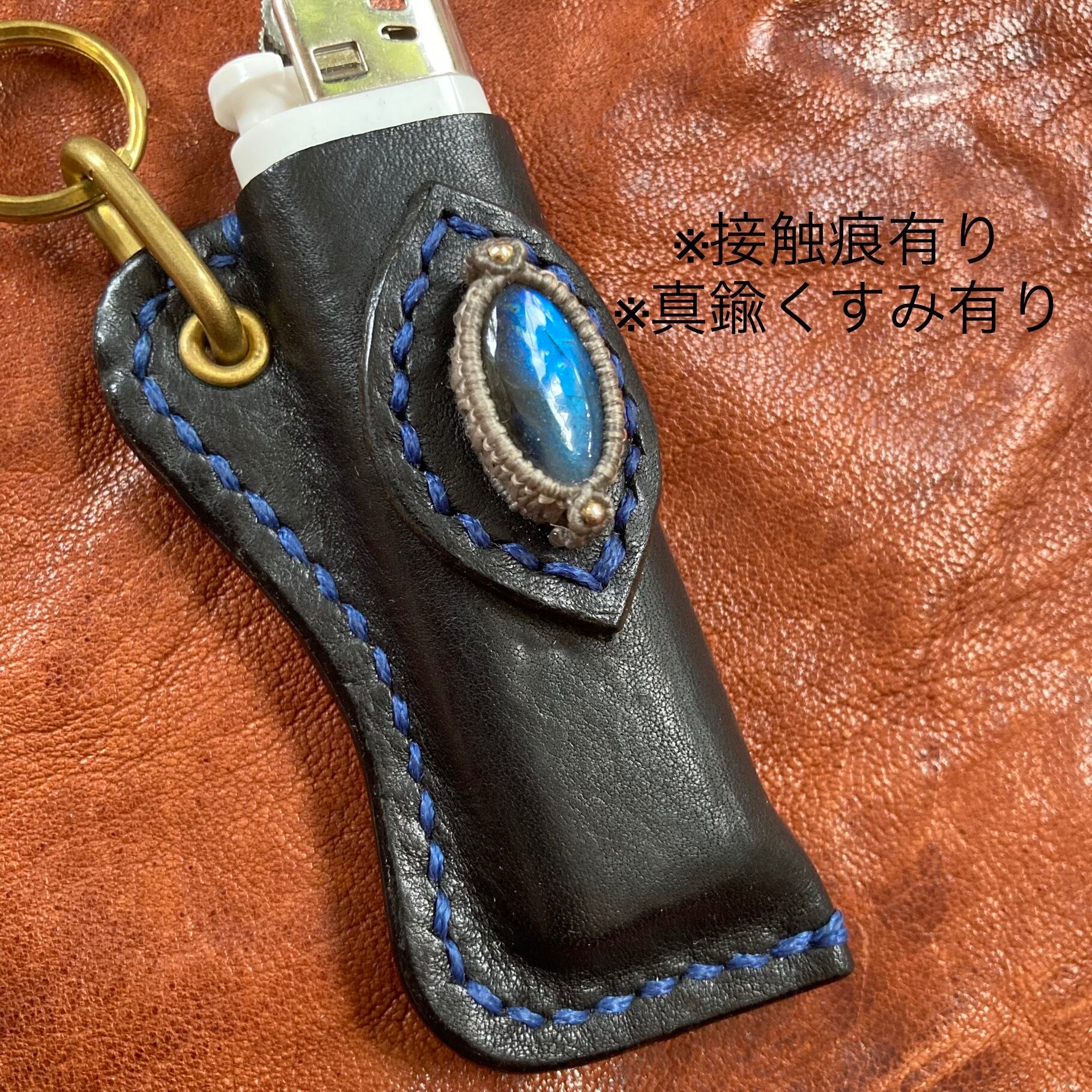 青と黒のクールな組み合わせに、妖しく煌めくラブラドライトをマクラメ装飾でしっかりとレザーに縫い付けています。