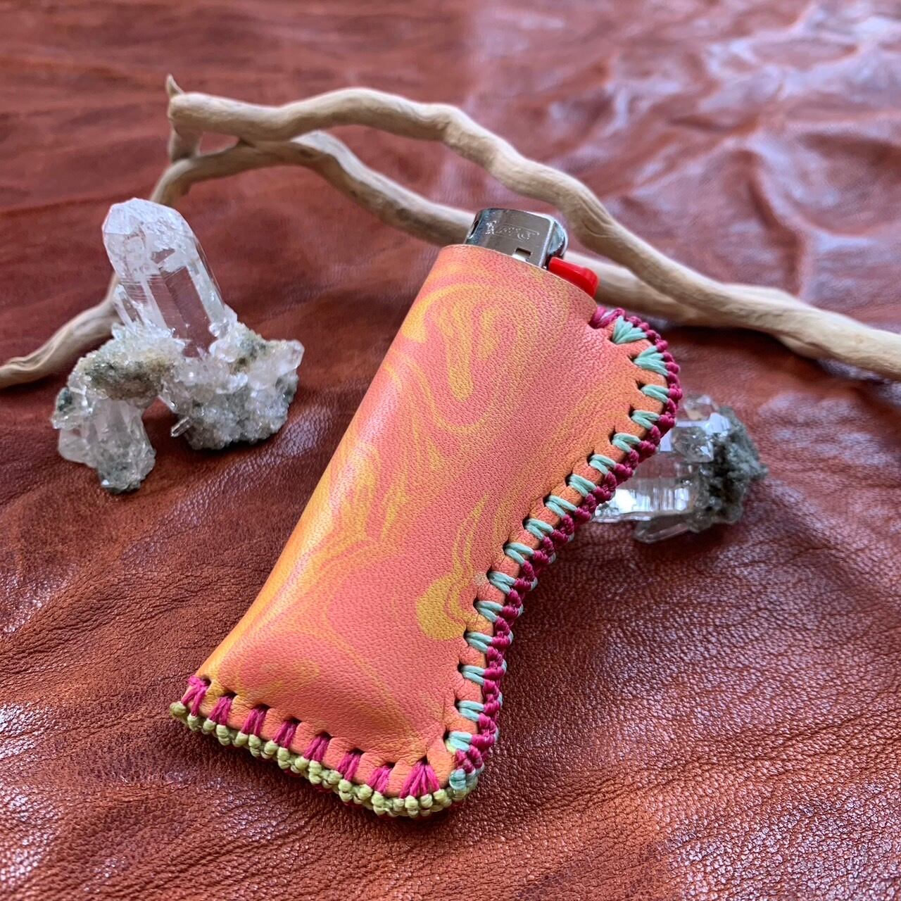 私の娘がマーブリング染めしたレザーを使ったオリジナルのライターカバーです。